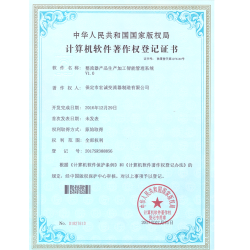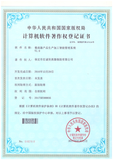 計算機軟件注冊權(quán)登記證書——整流器產(chǎn)品生產(chǎn)加工智能管理系統(tǒng)V1.0