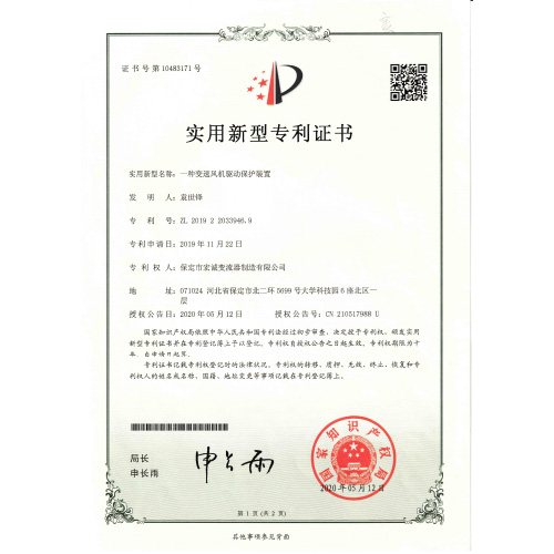 實用新型專利證書一種變速風(fēng)機驅(qū)動保護裝置