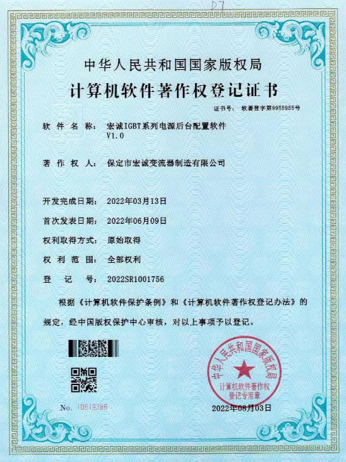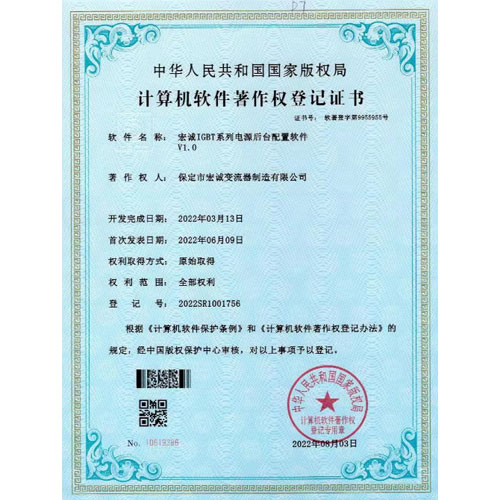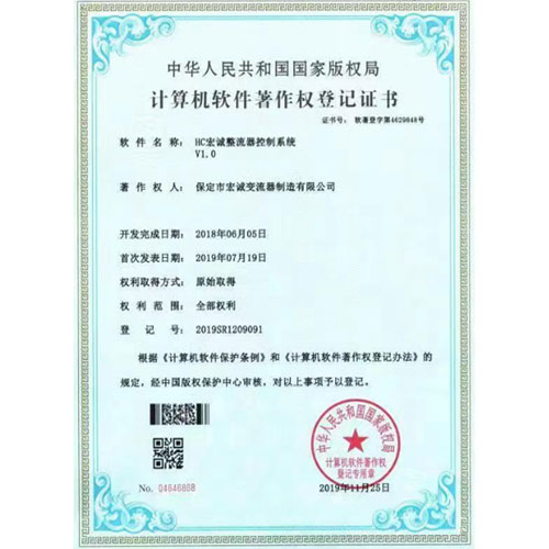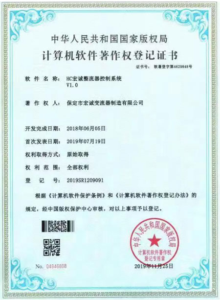 計算機軟件著作權(quán)登記證書--HC宏誠整流器控制系統(tǒng)V1.0