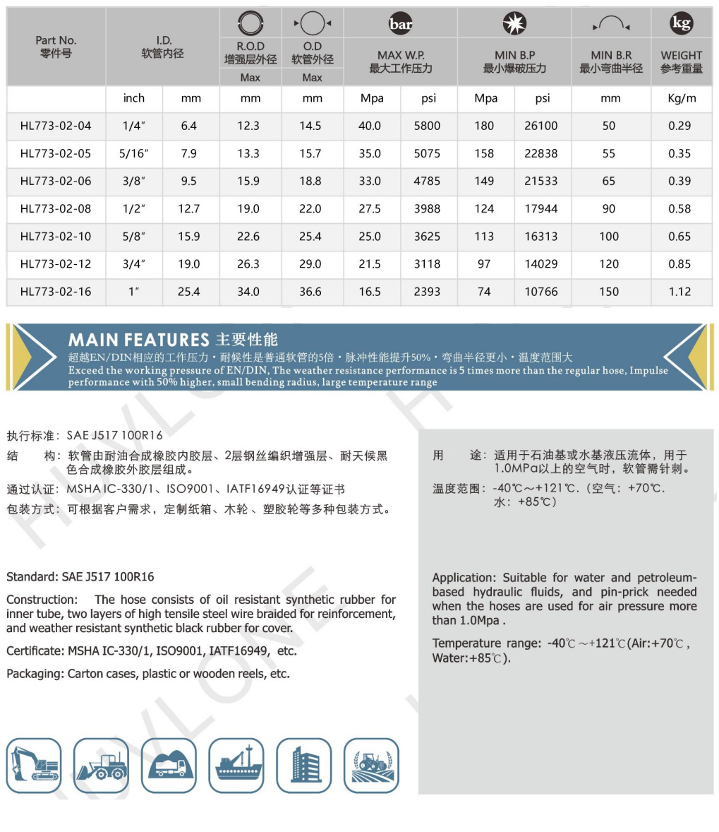 符合/超越SAEJ517 100R16二層鋼絲編織橡膠軟管