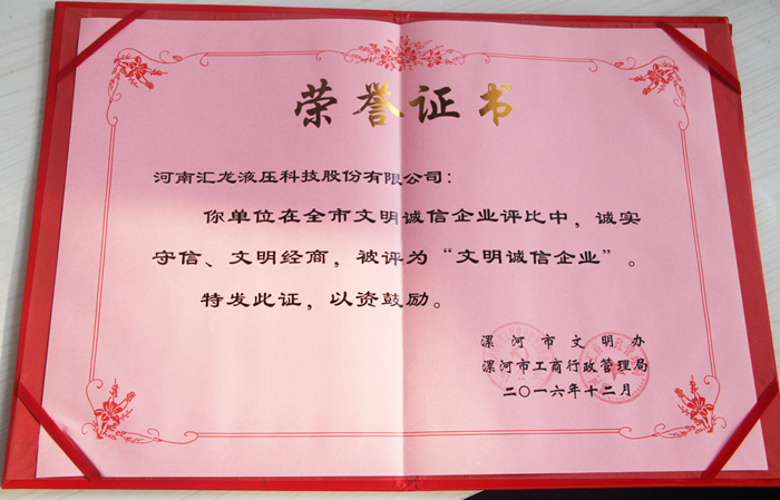 為培育和踐行社會(huì)主義核心價(jià)值觀,不斷提高公民道德素質(zhì)和社會(huì)文明程度,積極營造文明、誠信的社會(huì)環(huán)境,漯河市文明辦、漯河市工商局在全市開展“文明誠信企業(yè)、文明誠信商戶”的評(píng)選活動(dòng),通過有關(guān)部門層層嚴(yán)格把關(guān)、逐級(jí)推薦,河南匯龍液壓科技股份有限公司獲得了“2016年度文明誠信企業(yè)”的榮譽(yù)稱號(hào)。