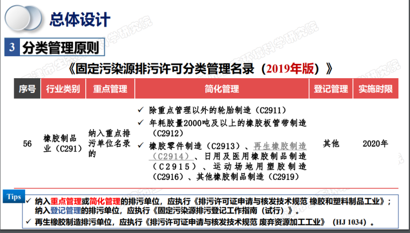 《技術(shù)規(guī)范》適用于執(zhí)行《橡膠制品工業(yè)污染物排放標準》(GB 27632)及輪胎翻新排污單位排放大氣污染物、水污染物的排污許可管理范圍。再生橡膠制造不適用于本標準,其適用于《排污許可證申請與核發(fā)技術(shù)規(guī)范 廢棄資源加工工業(yè)》(HJ 1034)。