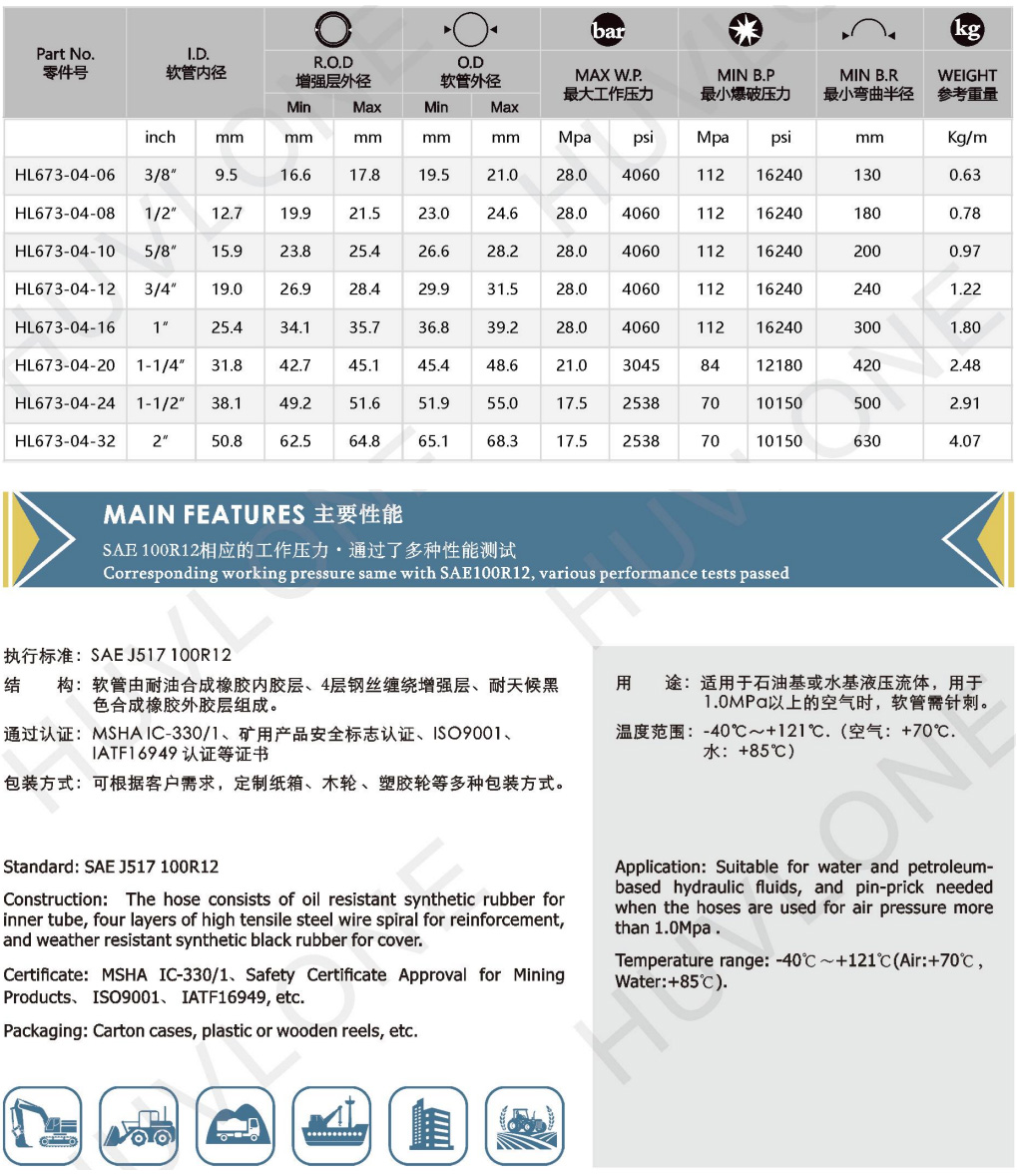 SAE J517 100R12: Four steel wires spiral rubber hydraulic hose
